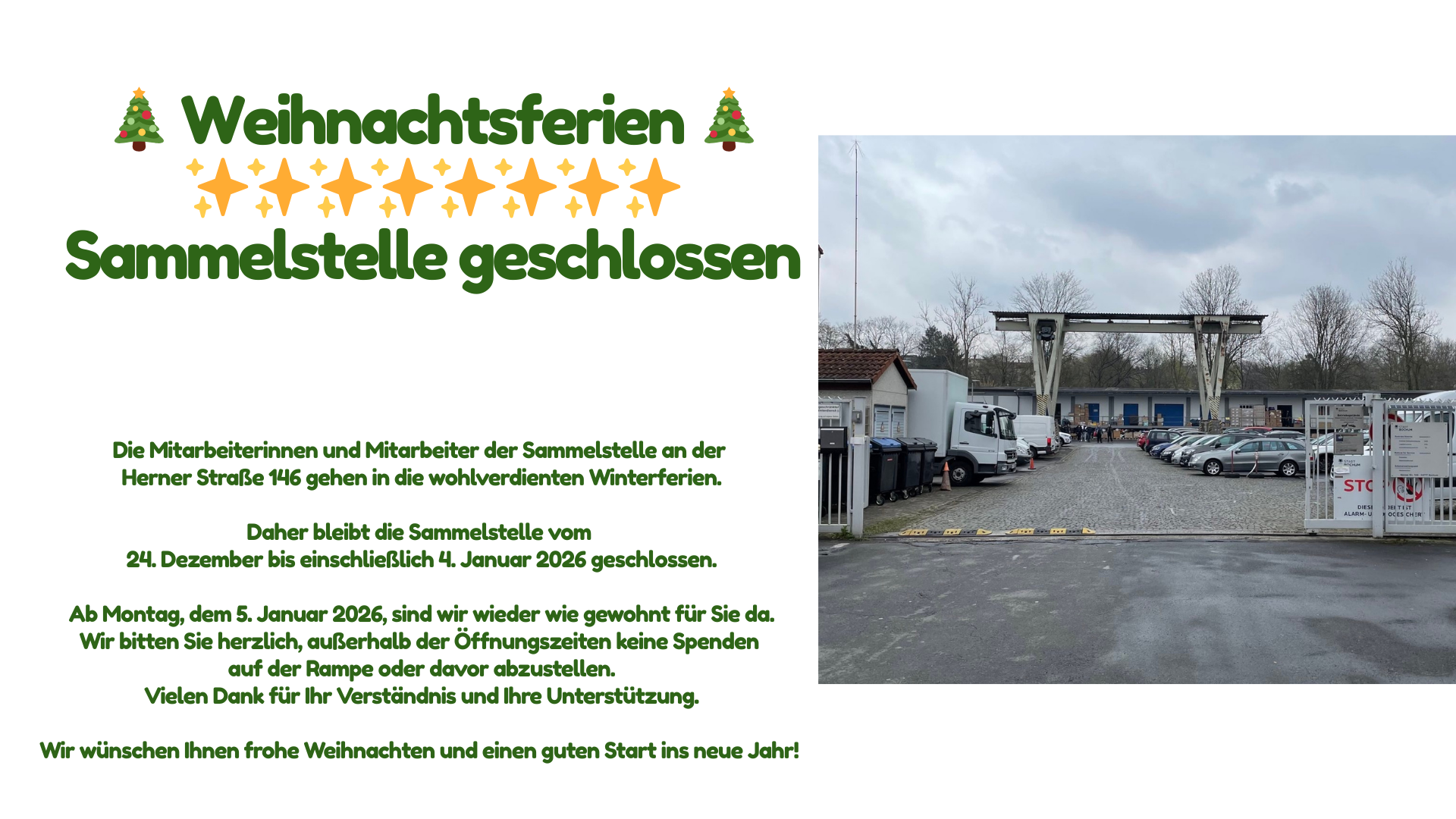 Die Mitarbeiterinnen und Mitarbeiter der Sammelstelle an derHerner Straße 146gehen in die wohlverdienten Weihnachtsferien. Daher bleibt die Sammelstellevom 24. Dezember 2025 bis einschließlich 4. Januar 2026 geschlossen. AbMontag, dem 5. Januar 2026, sind wir wieder wie gewohnt für Sie da. Wir bitten Sie herzlich,außerhalb der Öffnungszeiten keine Spenden auf der ...